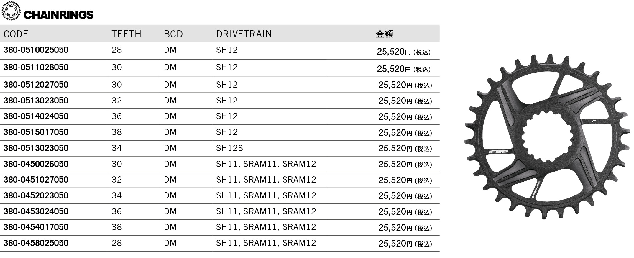 • Chainrings – 38T, 36T, 34T, 32T, 30T, 28T
