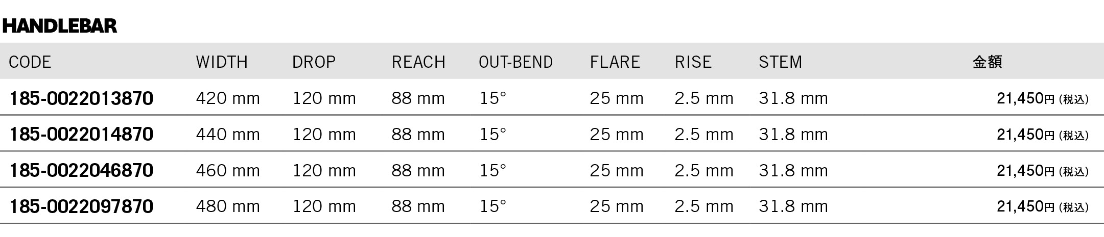 • Ø31.8mm x W420, 440, 460, 480mm
